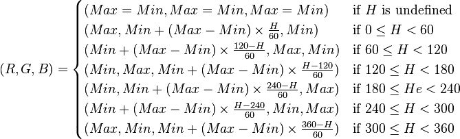 ・WikipediaにあるHueによる細かい場合分けは、R,G,Bが120°ずつずれたもの